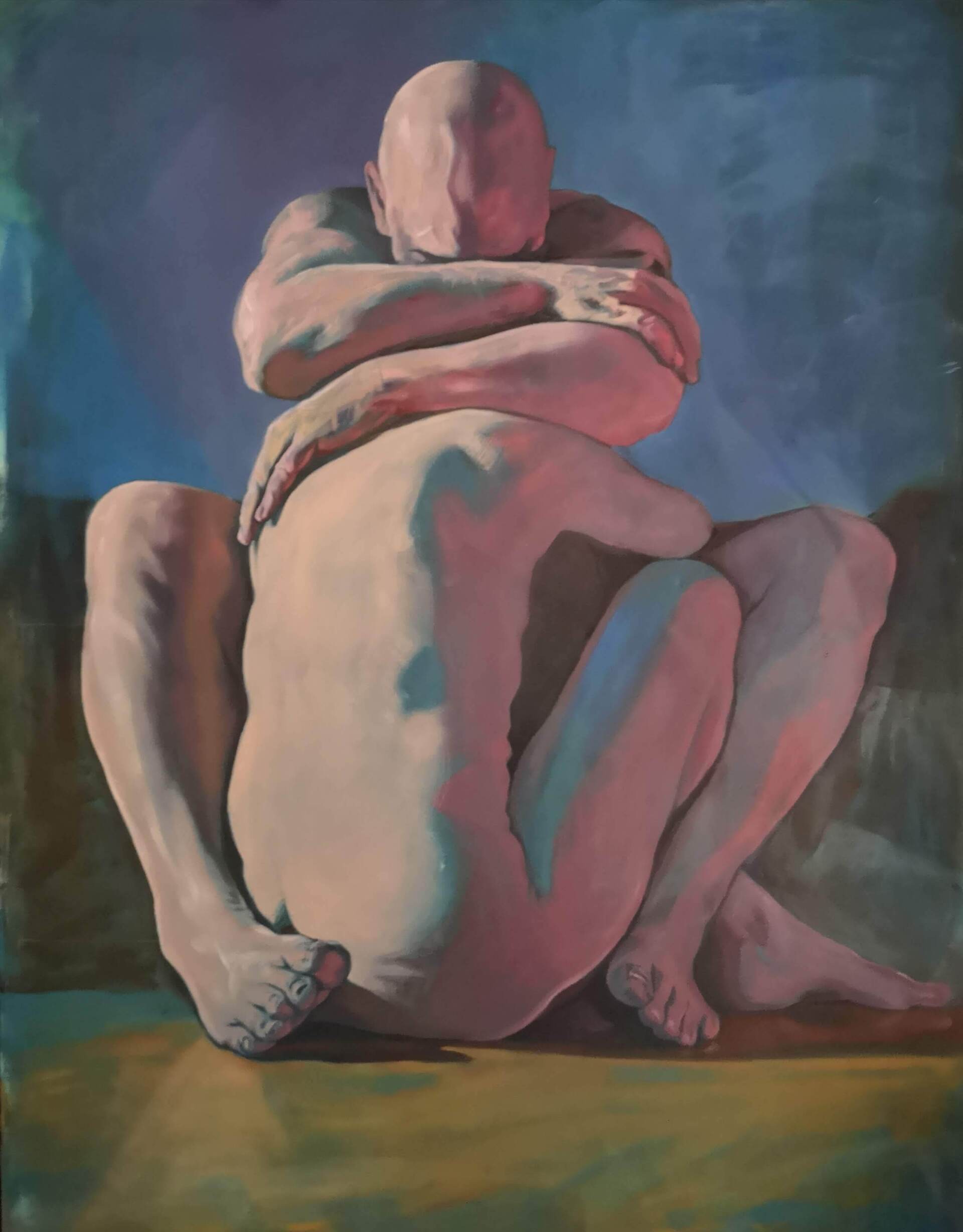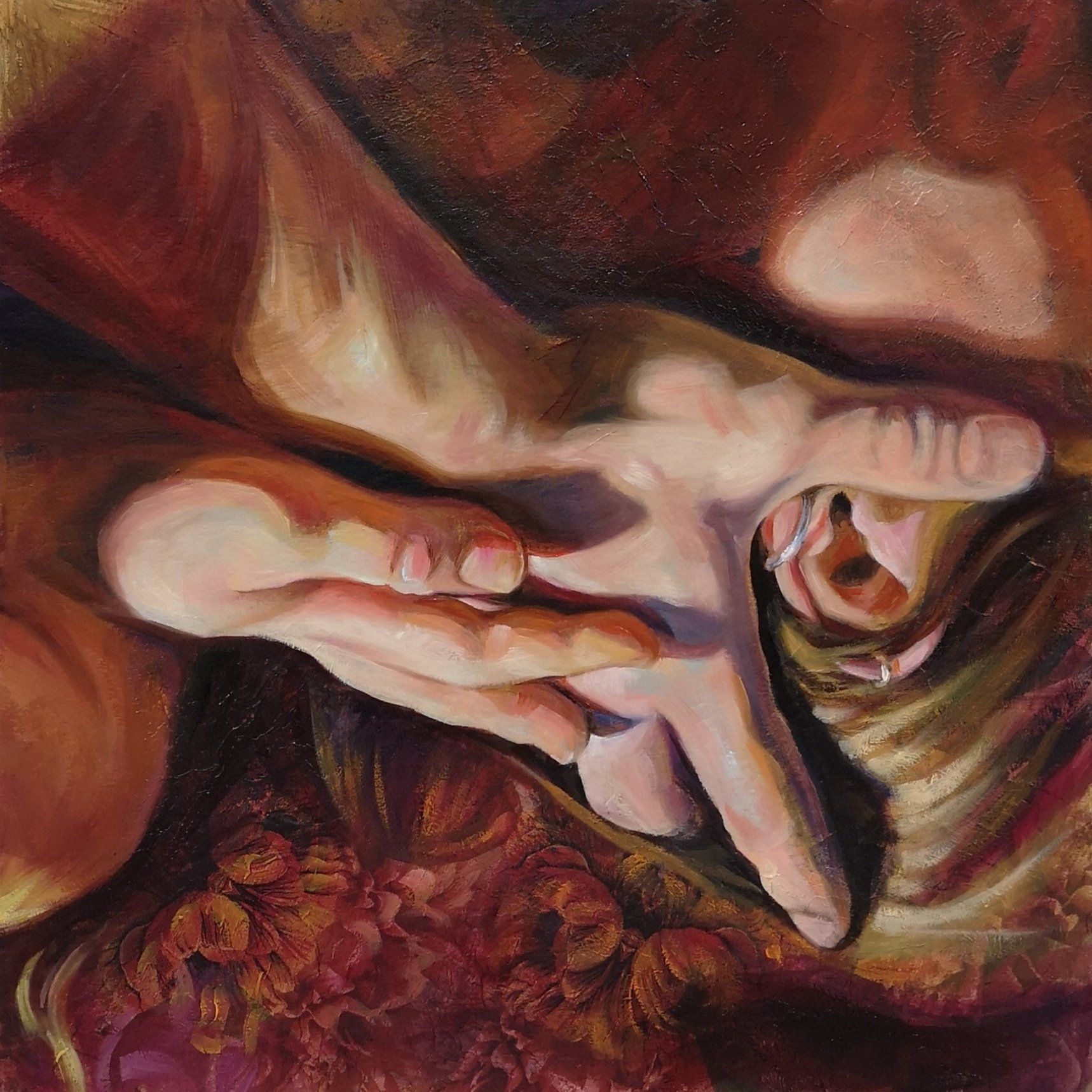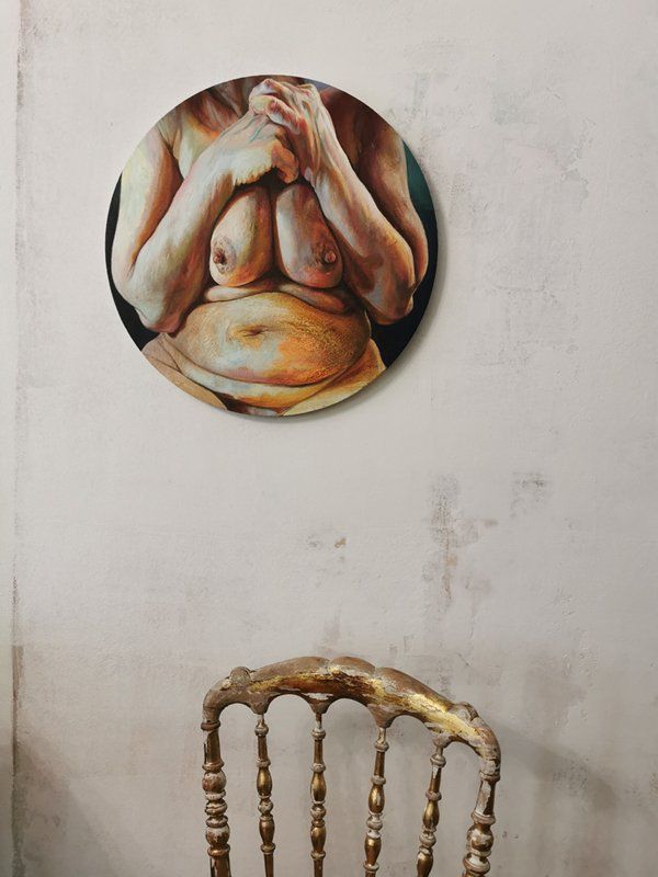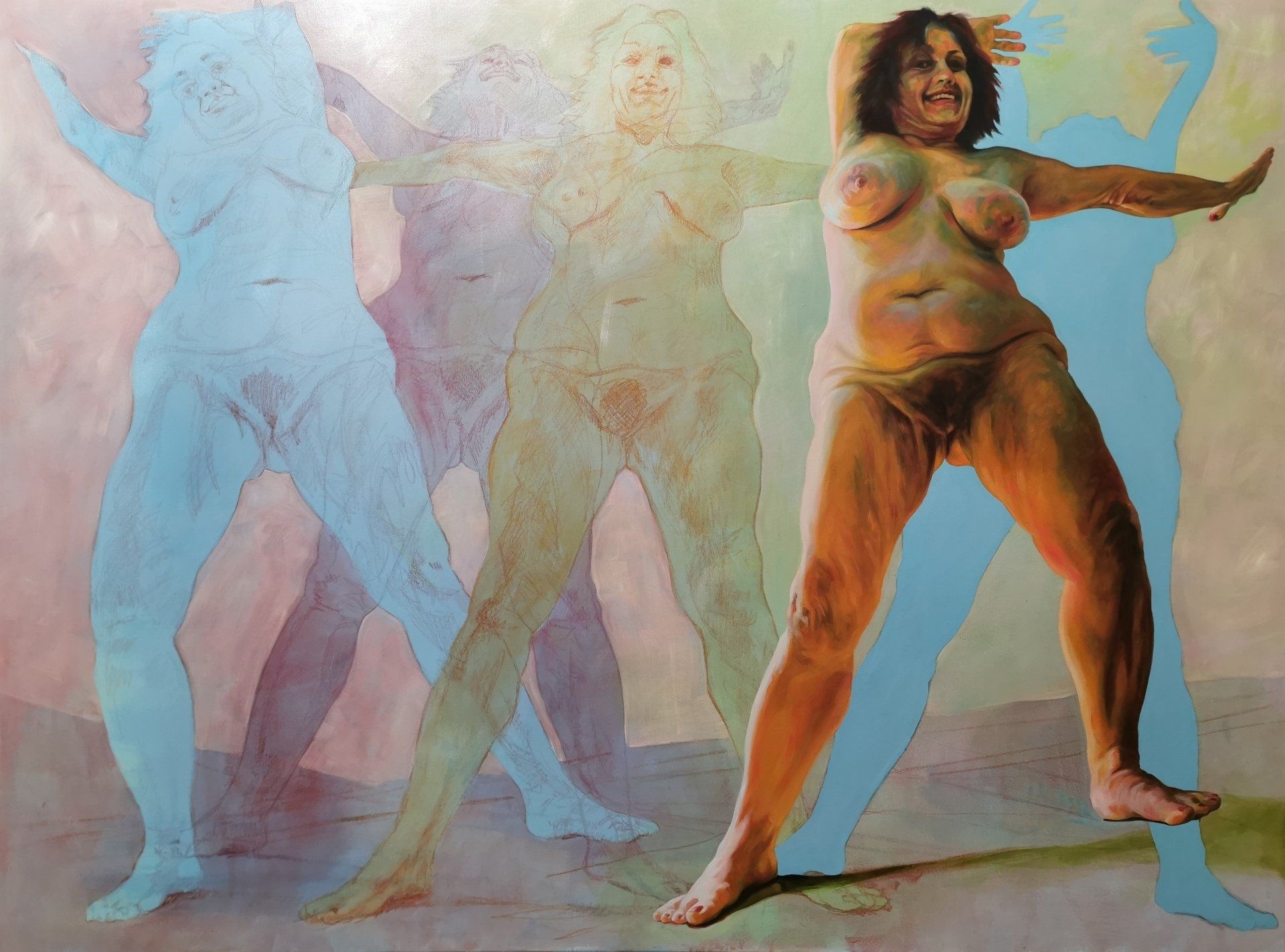 "The title of the work "Lakshmi Abundance" reflects the direction in which the viewer can look at this large-format oil painting: Lakshmi, as the Hindu goddess of happiness, love, fertility and beauty, is identified with an older woman, her abdominal bulge and the The shape of the breasts not only refer to old age, but also reflect a life that has been lived in. The female figure, shown from an unusual angle, puts her hands in front of her face as if she wants to hide her face and thus close herself to the truth and old age to want to and feels shame for it. The steep angle from below, rendered in extreme perspective, reinforces the desperate message of this portrait", excerpt: Gabriele Baumgartner, curator and art historian.