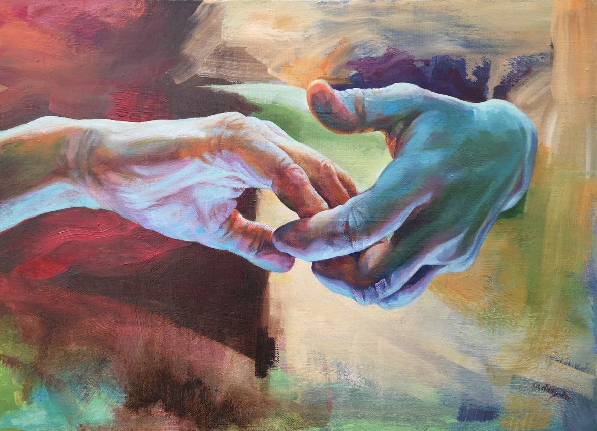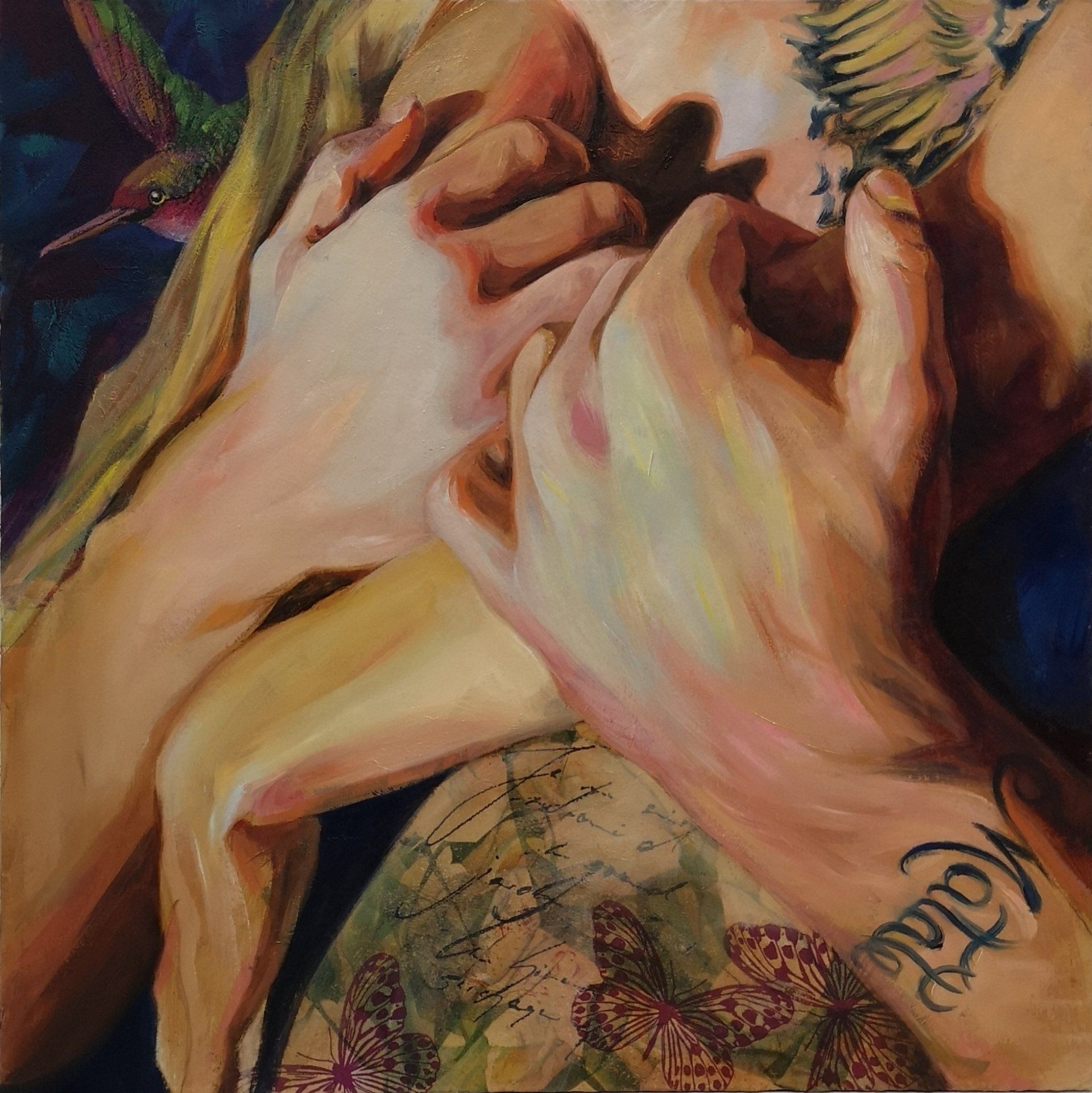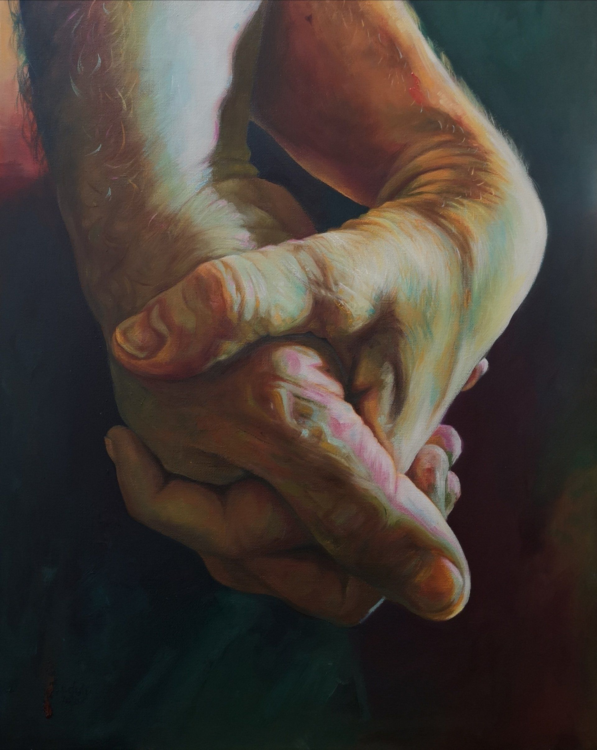 "The title of the work "Lakshmi Abundance" reflects the direction in which the viewer can look at this large-format oil painting: Lakshmi, as the Hindu goddess of happiness, love, fertility and beauty, is identified with an older woman, her abdominal bulge and the The shape of the breasts not only refer to old age, but also reflect a life that has been lived in. The female figure, shown from an unusual angle, puts her hands in front of her face as if she wants to hide her face and thus close herself to the truth and old age to want to and feels shame for it. The steep angle from below, rendered in extreme perspective, reinforces the desperate message of this portrait", excerpt: Gabriele Baumgartner, curator and art historian.